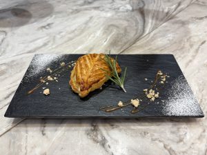 中にはハースニップとよばれる(別名:白い人参)とくるみをサンドして3層のミルフィーユ仕立てに仕上げました