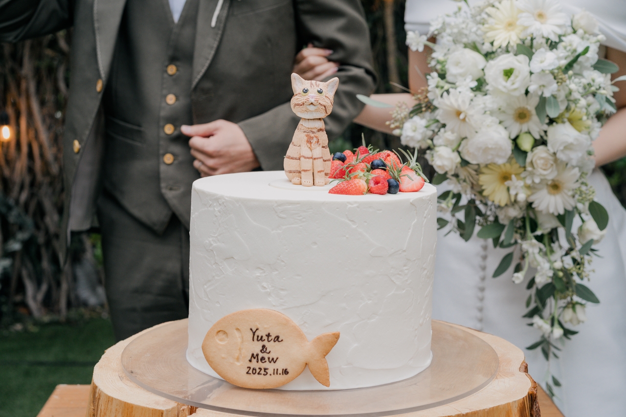 おふたりの愛猫のティグルが乗ったとってもかわいいウエディングケーキ🐈